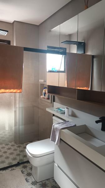 Banheiro social com box de vidro;